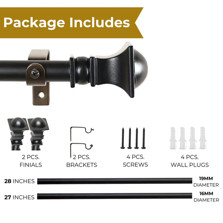 Metal Half Round Finial Extendable Curtain Rod Black 19MM (Hardware Included)